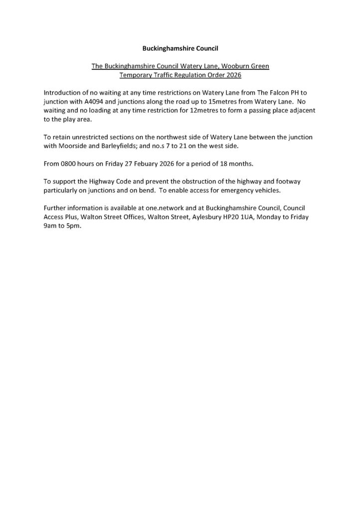 Further information is available at one.network and at Buckinghamshire Council, Council Access Plus, Walton Street Offices, Walton Street, Aylesbury HP20 1UA, Monday to Friday 9am to 5pm.
